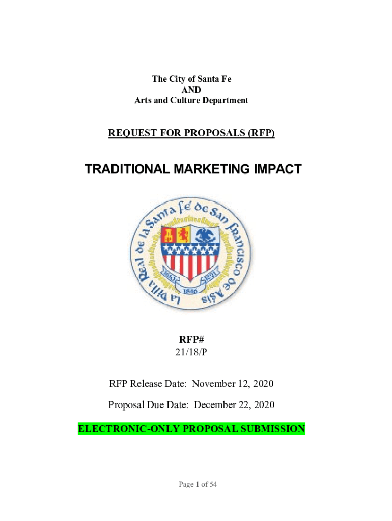 The City of Santa Fe AND Arts and Culture DepartmentREQUEST FOR PROPOSALS (RFP)TRADITIONAL MARKETING IMPACT RFP# 21/18/P RFP Release Date: November 12, 2020, Proposal Due Date: December 22, 2020,