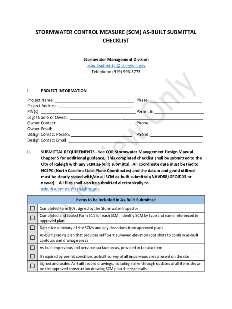 STORMWATER CONTROL MEASURE (SCM) BUILT SUBMITTAL CHECKLIST Stormwater Management Division asbuiltsubmittal Raleigh.gov Telephone (919) 9963773I.PROJECT INFORMATIONProject Name: Phase: Project Address: