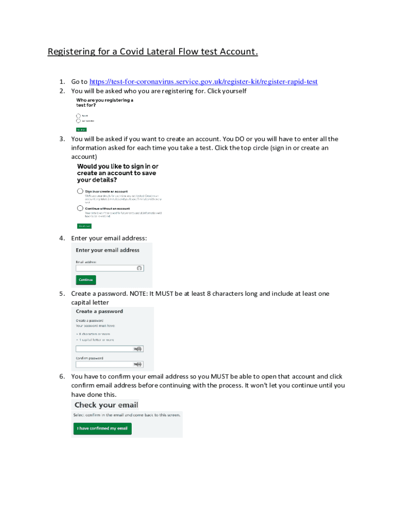 Registering for a COVID-19 Lateral Flow test Account. 1. Go to https://testforcoronavirus.service.gov.uk/registerkit/registerrapidtest 2. You will be asked who you are registering for. Click yourself3.