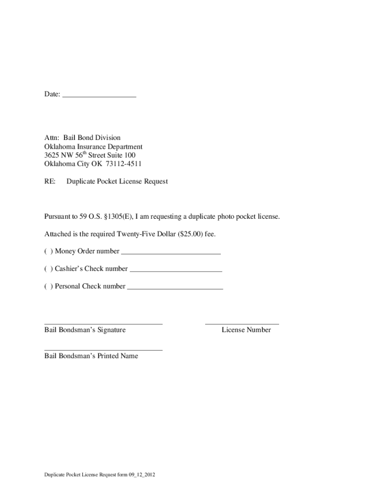 Date: Attn: Bail Bond Division Oklahoma Insurance Department 3625 NW 56th Street Suite 100 Oklahoma City OK 731124511 RE:Duplicate Pocket License RequestPursuant to 59 O.S. 1305(E), I am requesting