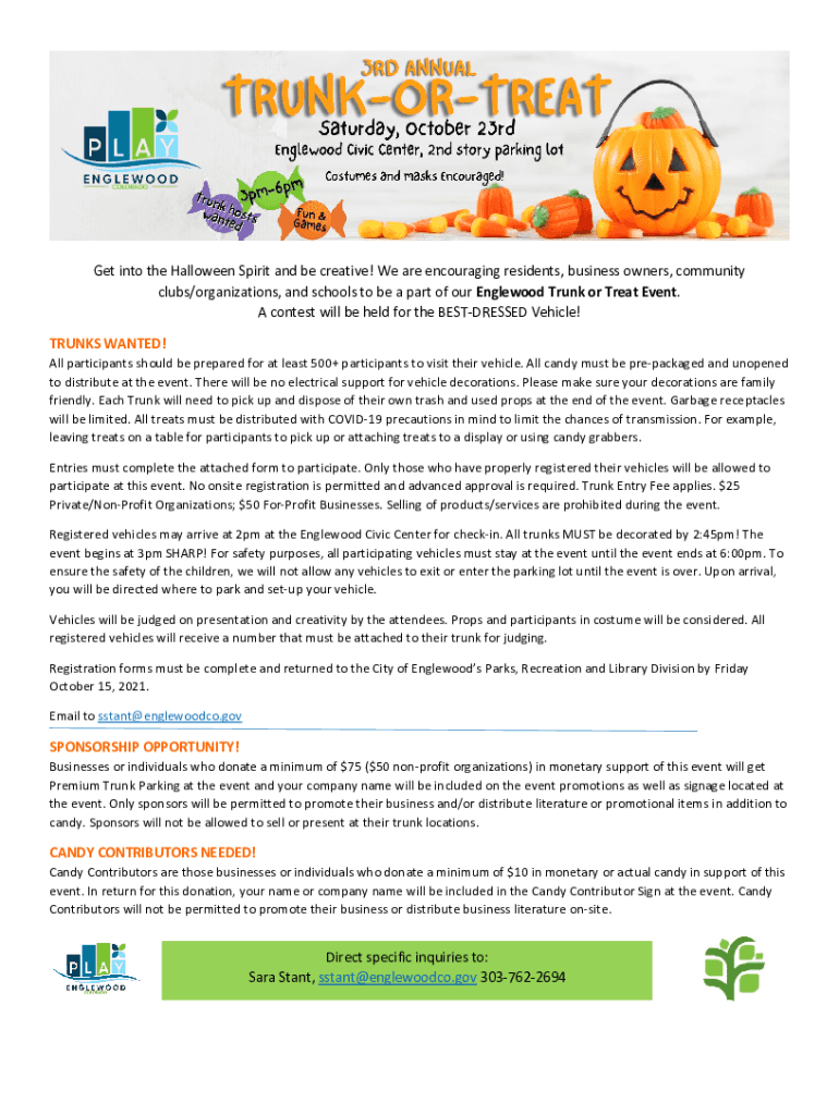 Get into the Halloween Spirit and be creative! We are encouraging residents, business owners, community clubs/organizations, and schools to be a part of our Englewood Trunk or Treat Event. A contest