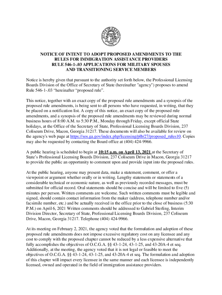 NOTICE OF INTENT TO ADOPT PROPOSED AMENDMENTS TO THE RULES FOR IMMIGRATION ASSISTANCE PROVIDERS RULE 5461.03 APPLICATIONS FOR MILITARY SPOUSES AND TRANSITIONING SERVICE MEMBERS Notice is hereby given