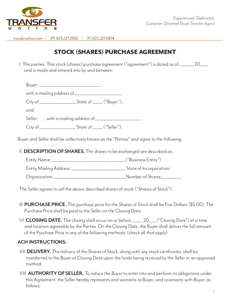 Experienced, Dedicated, CustomerOriented Stock Transfer Agent transferonline.com P 503.227.2950 F 503.227.6874STOCK (SHARES) PURCHASE AGREEMENT I. The parties. This stock (shares) purchase agreement