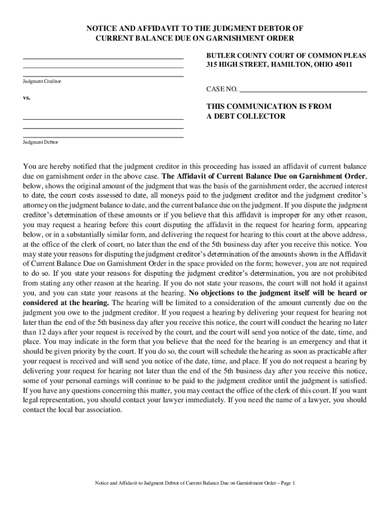 NOTICE AND AFFIDAVIT TO THE JUDGMENT DEBTOR OF CURRENT BALANCE DUE ON GARNISHMENT ORDER BUTLER COUNTY COURT OF COMMON PLEAS 315 HIGH STREET, HAMILTON, OHIO 45011 Judgment Creditor CASE NO. vs. THIS