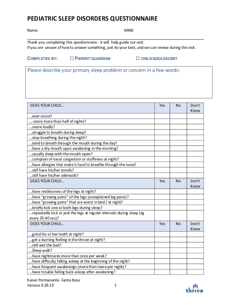 Get the free PEDIATRIC SLEEP DISORDERS QUESTIONNAIRE - mydoctor kaiserpermanente