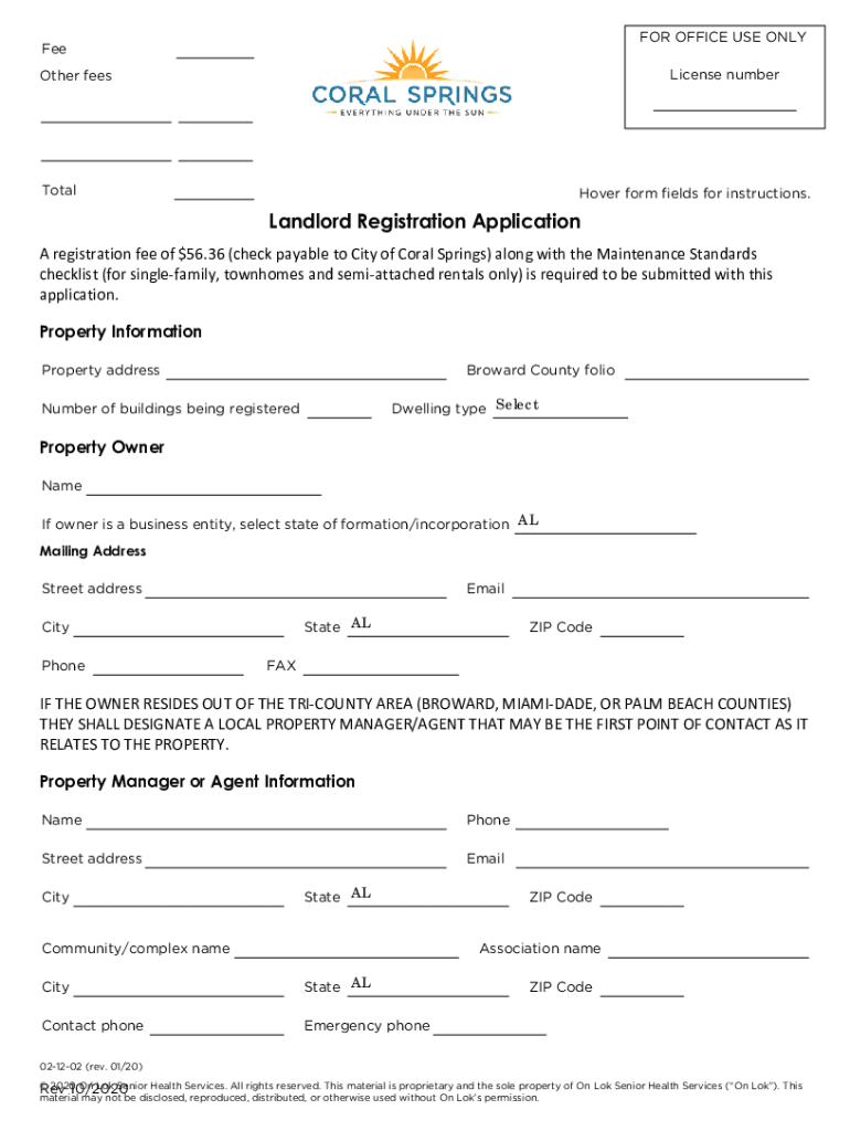 FOR OFFICE USE ONLYFeeLicense numberOther feesTotalHover form fields for instructions. Landlord Registration Application A registration fee of $56.36 (check payable to City of Coral Springs) along