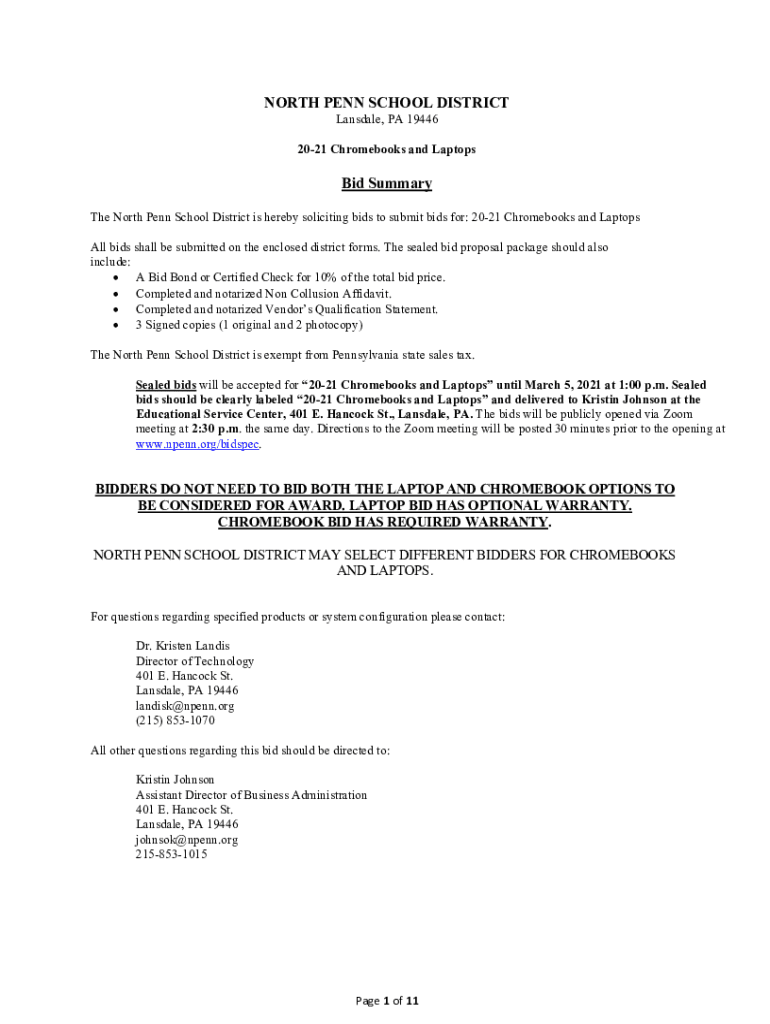 NORTH PENN SCHOOL DISTRICT Lawndale, PA 19446 2021 Chromebooks and Laptops Summary The North Penn School District is hereby soliciting bids to submit bids for: 2021 Chromebooks and Laptops All bids