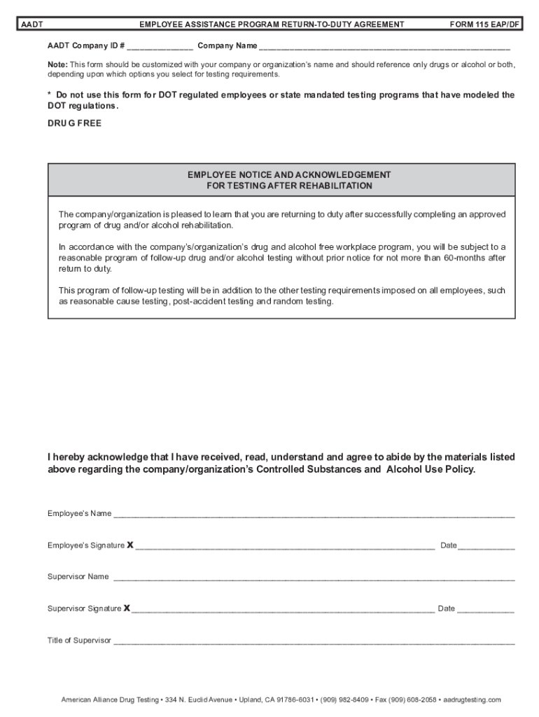 AADTEMPLOYEE ASSISTANCE PROGRAM RETURNTODUTY AGREEMENTFORM 115 EAP/DFA ADT Company ID # Company Name Note: This form should be customized with your company or organizations name and should reference
