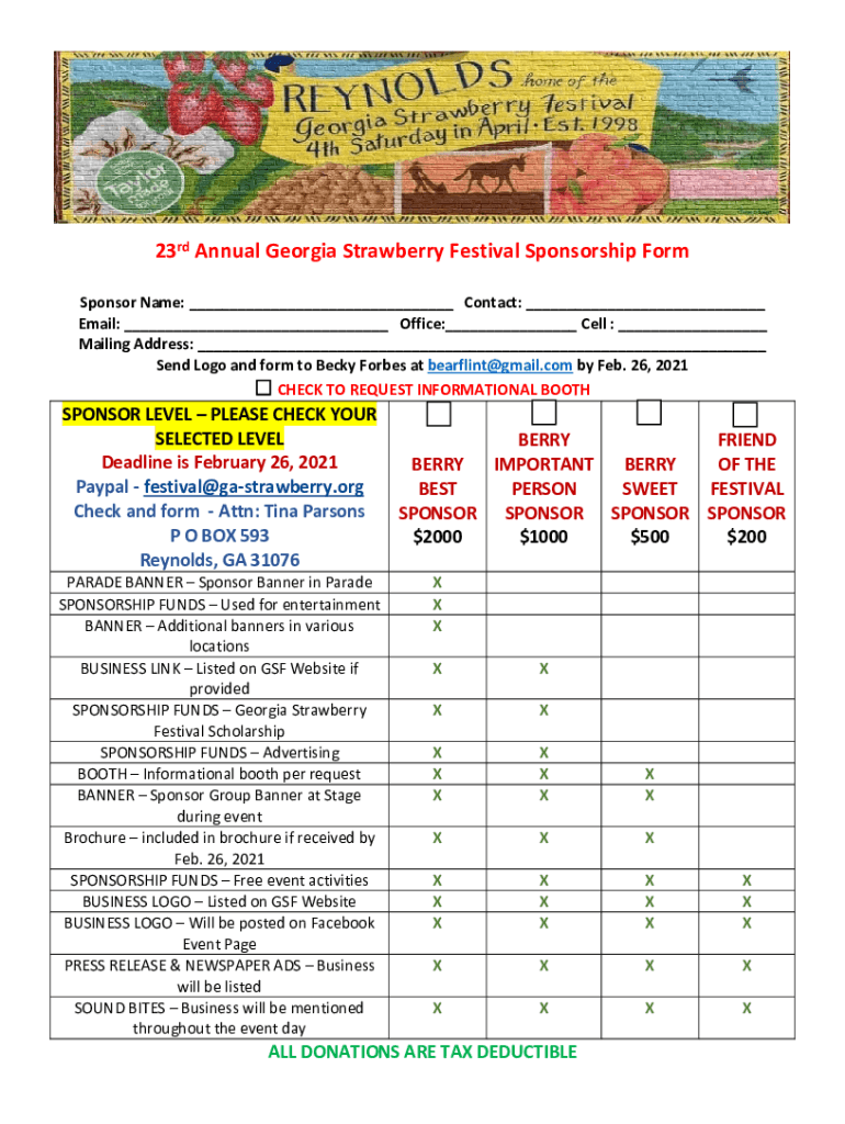 23rd Annual Georgia Strawberry Festival Sponsorship Form Sponsor Name: Contact: Email: Office: Cell : Mailing Address: Send Logo and form to Becky Forbes at bear flint gmail.com by Feb. 26, 2021 CHECK