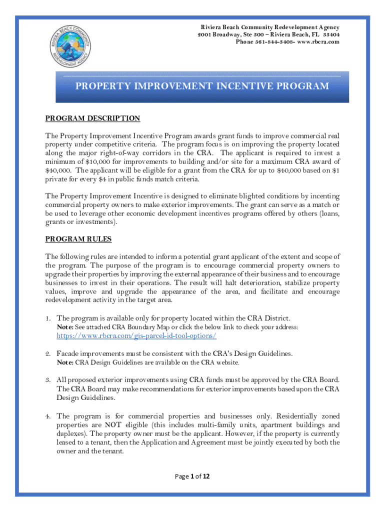 Riviera Beach Community Redevelopment Agency 2001 Broadway, Ste 300 Riviera Beach, FL 33404 Phone 5618443408 www.rbcra.comPROPERTY IMPROVEMENT INCENTIVE PROGRAM DESCRIPTION The Property Improvement