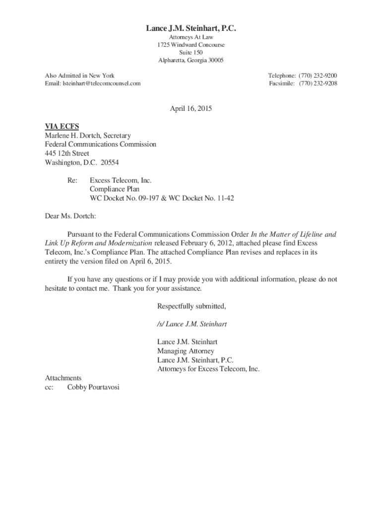 Lance J.M. Stein hart, P.C. Attorneys At Law 1725 Windward Concourse Suite 150 Alpharetta, Georgia 30005 Also Admitted in New York Email: Steinhardt telecomcounsel.telephone: (770) 2329200 Facsimile:
