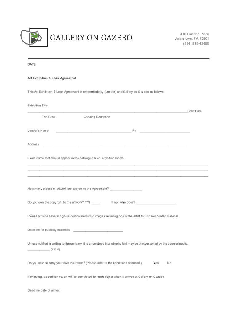 410 Gazebo Place Johnstown, PA 15901 (814) 53943450DATE:Art Exhibition & Loan Agreements Art Exhibition & Loan Agreement is entered into by (Lender) and Gallery on Gazebo as follows:Exhibition Title