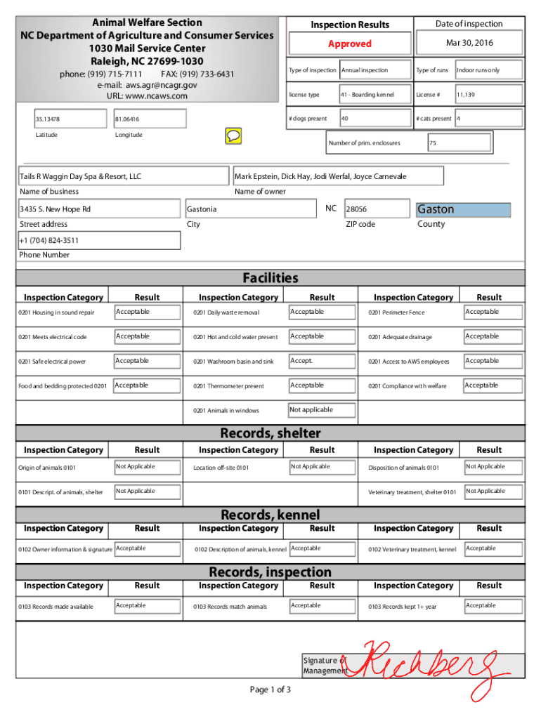 Animal Welfare Section NC Department of Agriculture and Consumer Services 1030 Mail Service Center Raleigh, NC 276991030 phone: (919) 7157111 FAX: (919) 7336431 email: AWS.AGR CAGR.gov URL: www.ncaws.com
