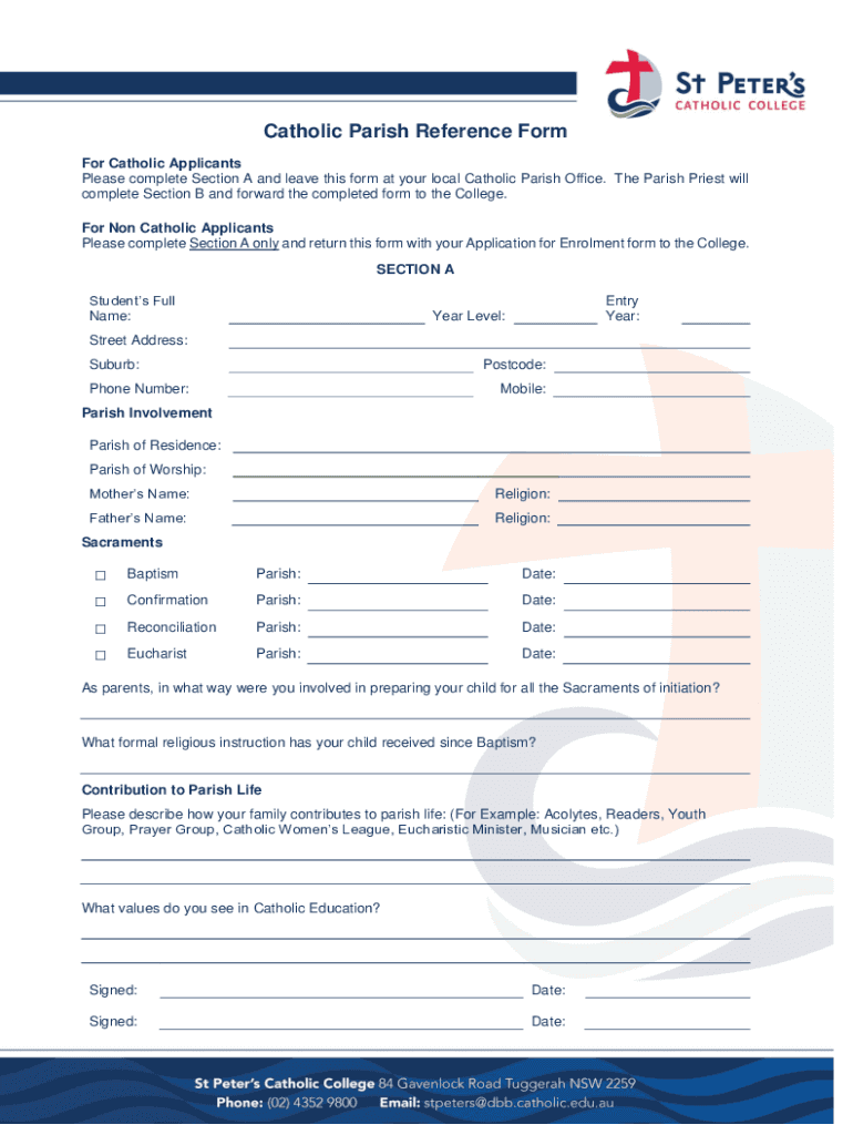 Catholic Parish Reference Form For Catholic Applicants Please complete Section A and leave this form at your local Catholic Parish Office. The Parish Priest will complete Section B and forward the