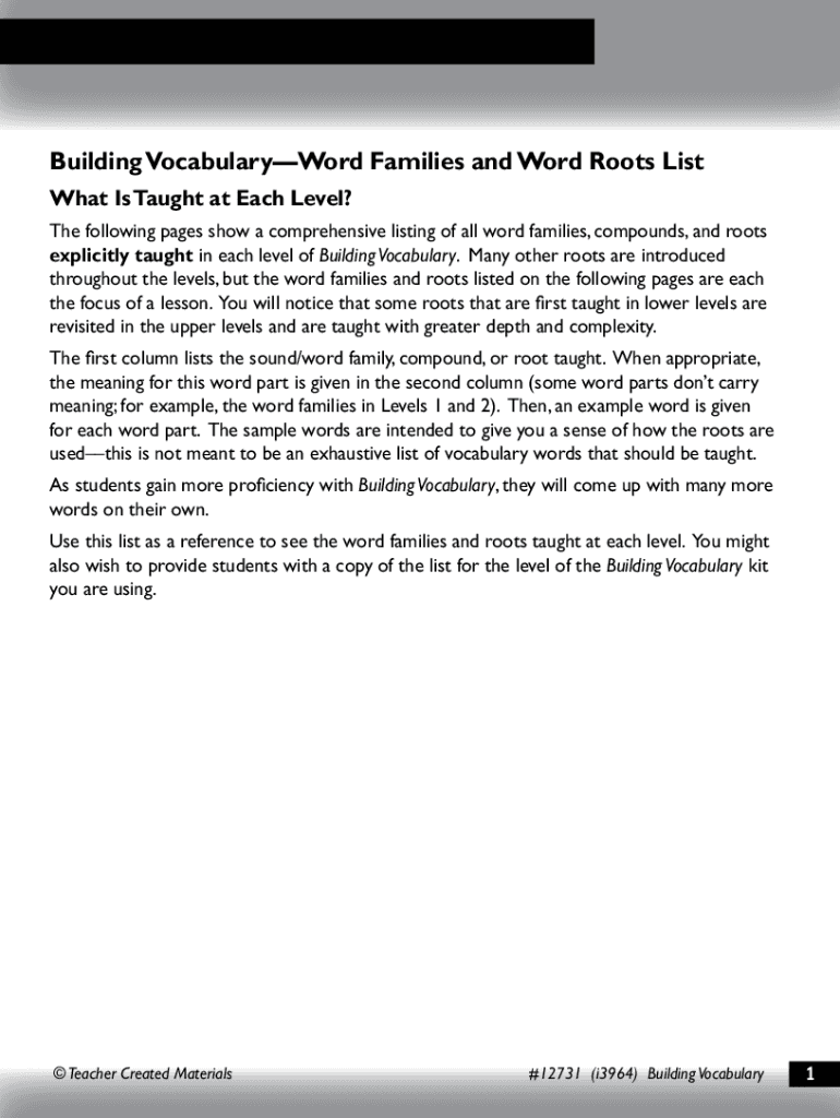 Building VocabularyWord Families and Word Roots List What Is Taught at Each Level? The following pages show a comprehensive listing of all word families, compounds, and roots explicitly taught in