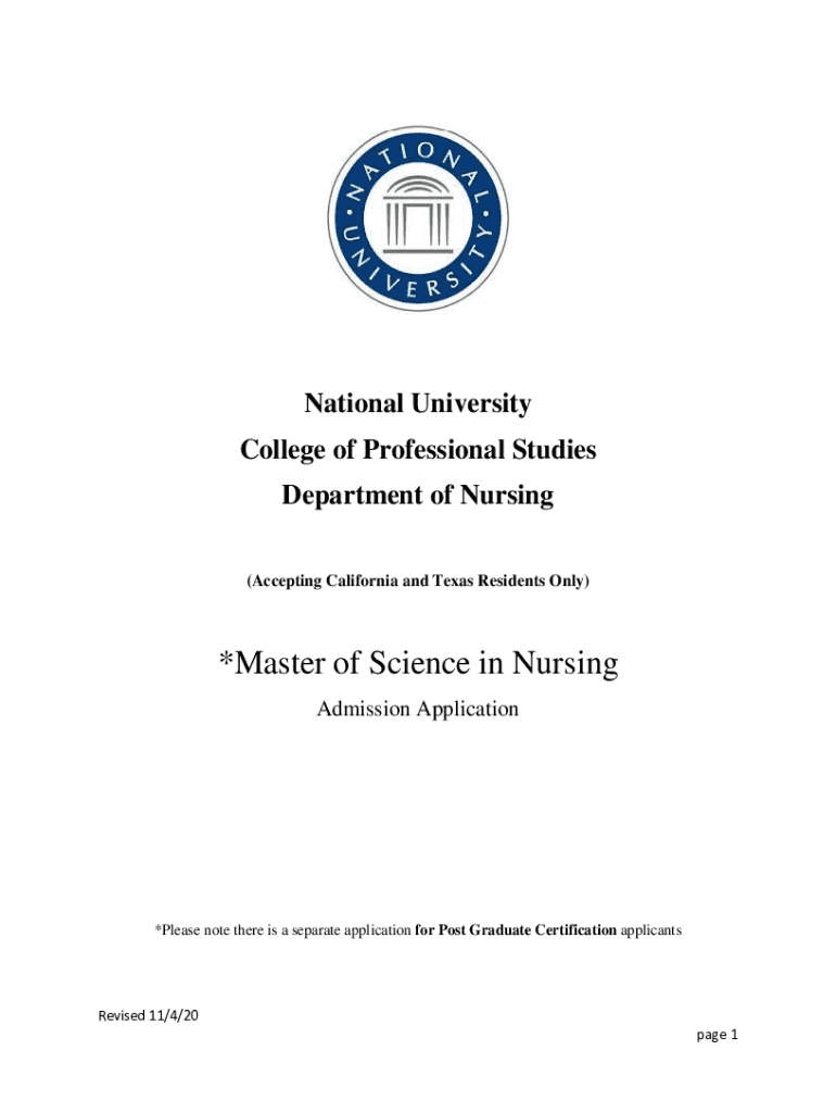 National University College of Professional Studies Department of Nursing (Accepting California and Texas Residents Only)*Master of Science in Nursing Admission Application Please note there is a