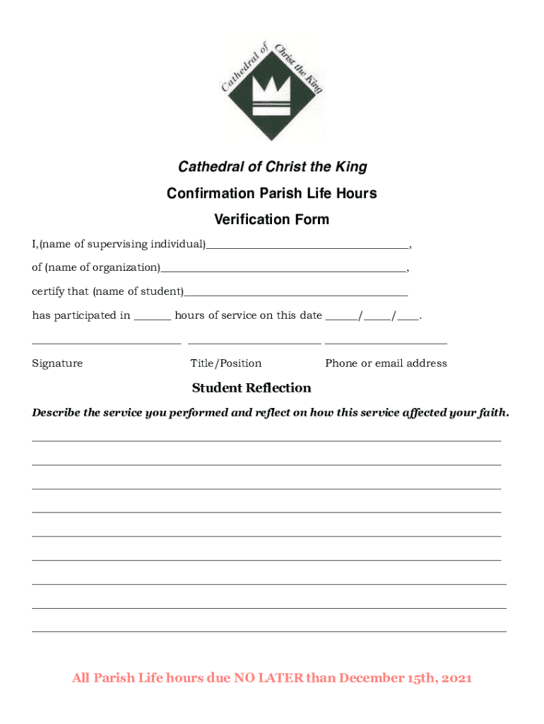Cathedral of Christ the King Con ration Parish Life Hour Very cation For I, (name of supervising individual), of (name of organization), certify that (name of student) has participated in hours of