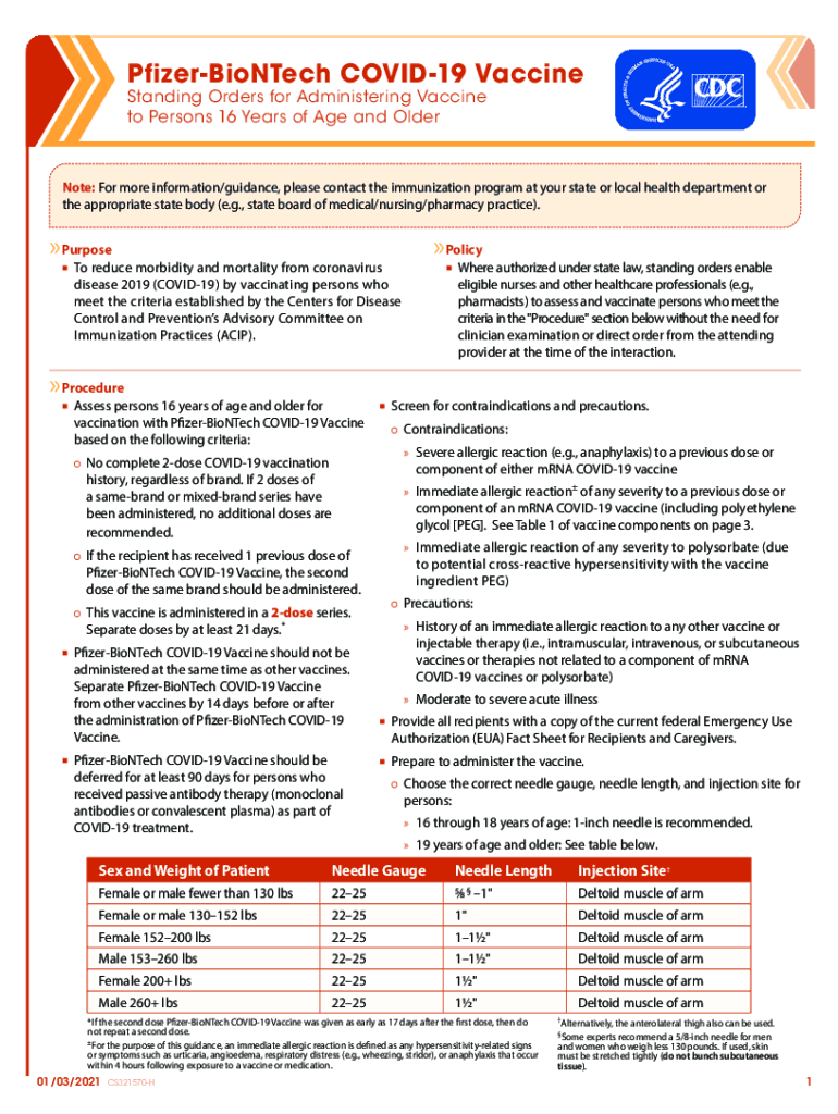 Pfizer BioNTech COVID-19 Vaccine Standing Orders for Administering Vaccine to Persons 16 Years of Age and Alternate: For more information/guidance, please contact the immunization program at your
