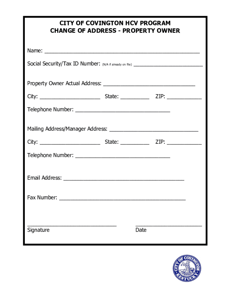 CITY OF COVINGTON CV PROGRAM CHANGE OF ADDRESS PROPERTY OWNER Name: Social Security/Tax ID Number:(N/A if already on file) Property Owner Actual Address: City: State: ZIP: Telephone Number: Mailing