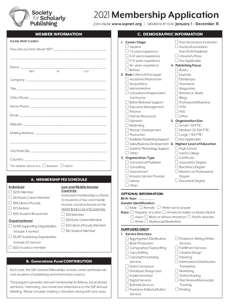 2021 Membership Application JOIN ONLINE www.sspnet.orgMEMBER INFORMATION. DEMOGRAPHIC INFORMATIONPLEASE PRINT Clearly did you hear about SSP? Name: FIRSTMILASTCompany: Title: Office Phone: Home Phone: