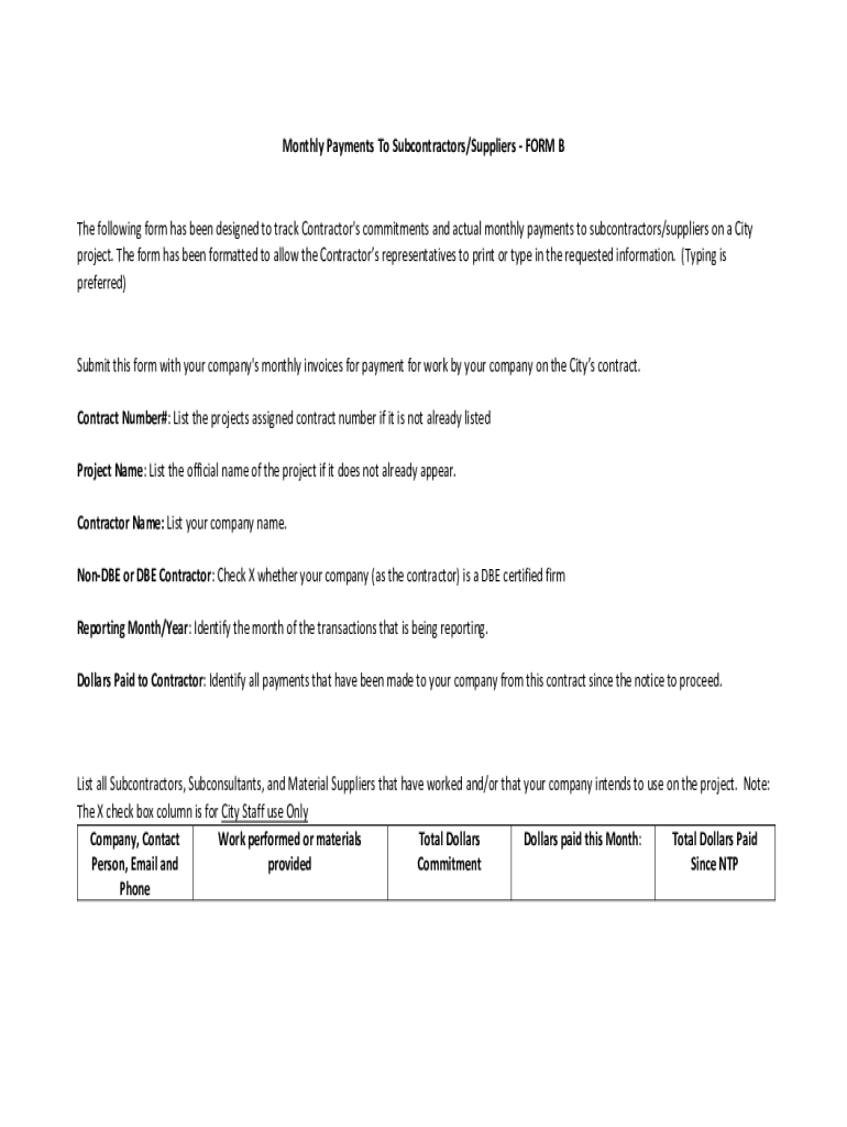 Monthly Payments To Subcontractors/Suppliers FORM The following form has been designed to track Contractor\'s commitments and actual monthly payments to subcontractors/suppliers on a City project.