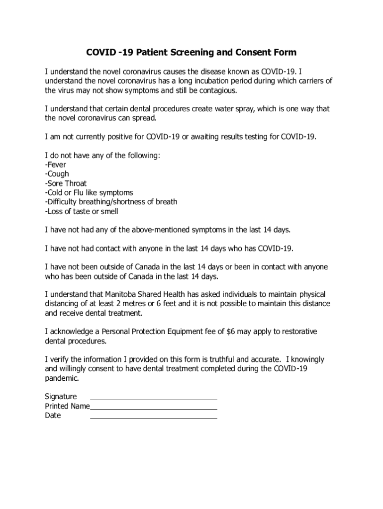 COVID-19 Patient Screening and Consent Form I understand the novel coronavirus causes the disease known as COVID-19. I understand the novel coronavirus has a long incubation period during which carriers