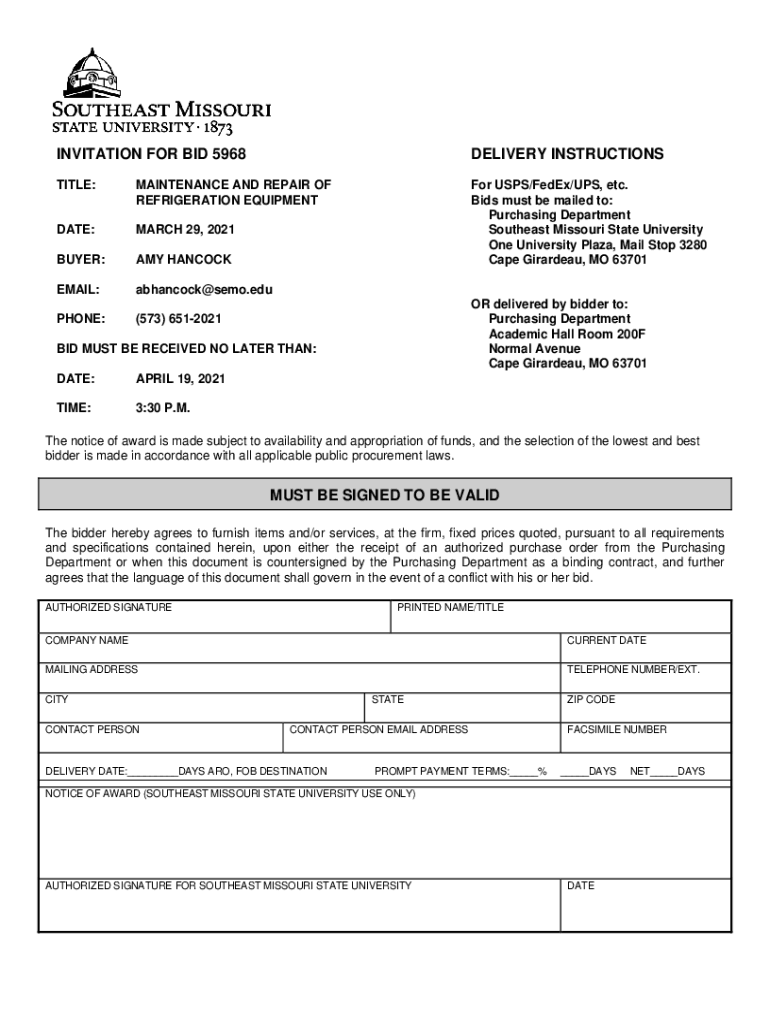 INVITATION FOR BID 5968DELIVERY INSTRUCTIONSTITLE:MAINTENANCE AND REPAIR OF REFRIGERATION EQUIPMENTDATE:MARCH 29, 2021BUYER:AMY Hancock USPS/FedEx/UPS, etc. Bids must be mailed to: Purchasing Department
