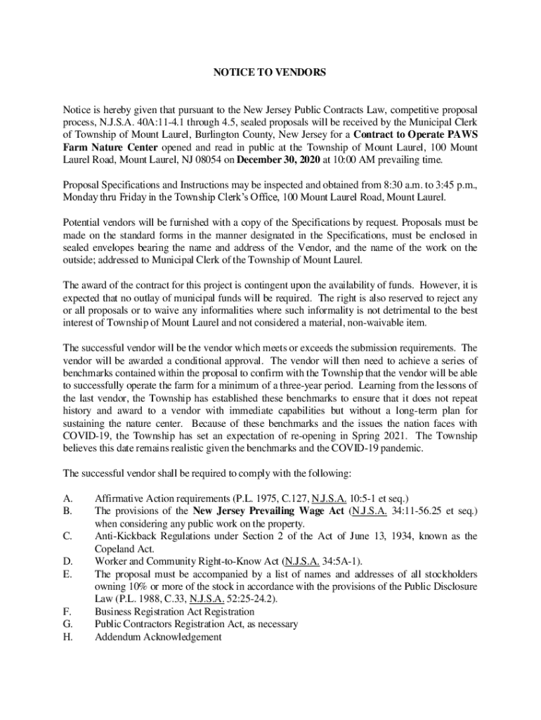 NOTICE TO VENDORSNotice is hereby given that pursuant to the New Jersey Public Contracts Law, competitive proposal process, N.J.S.A. 40A:114.1 through 4.5, sealed proposals will be received by the