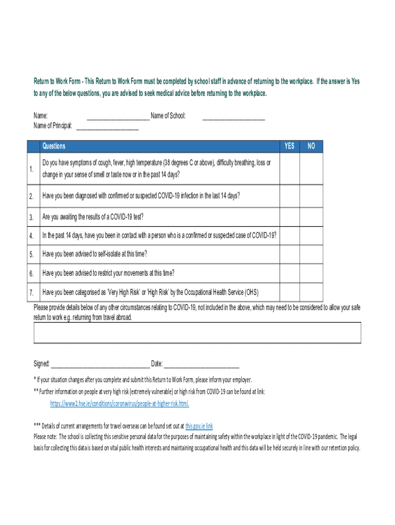 The Return to Work Form is an employment document used by school staff in Ireland to assess their health status prior to returning to the workplace during the COVID-19 pandemic.