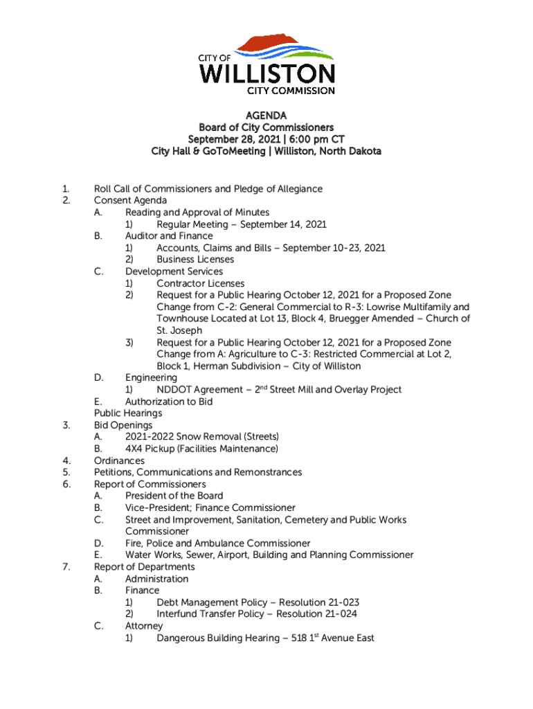AGENDA Board of City Commissioners September 28, 2021 | 6:00 pm CT City Hall & GoToMeeting | Williston, North Dakota1. 2.3. 4. 5. 6.7. Roll Call of Commissioners and Pledge of Allegiance Consent Agenda