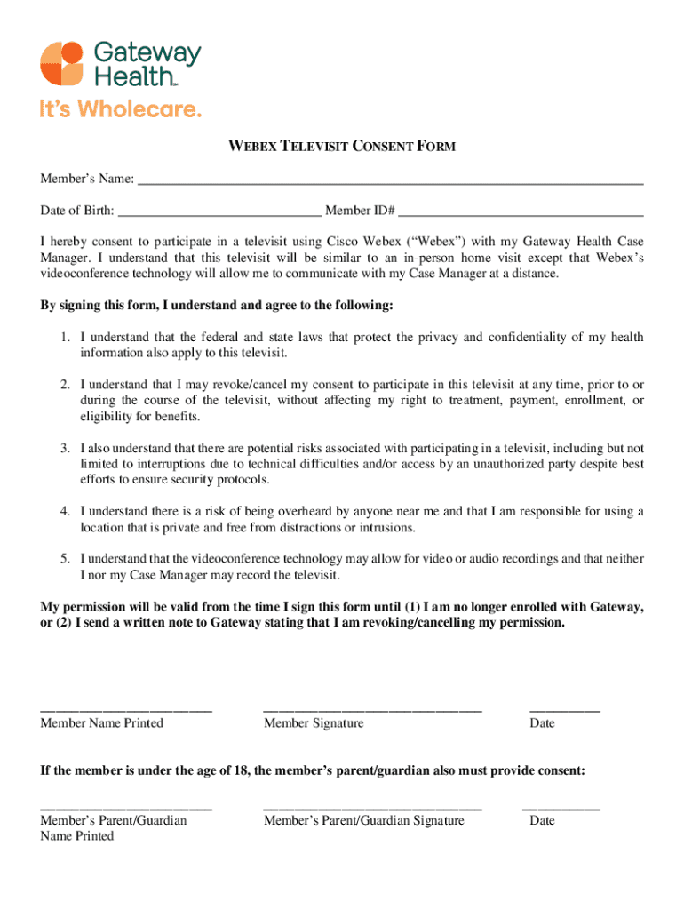 WEBEX TELEVISION CONSENT FORM Members Name: Date of Birth:Member ID#I hereby consent to participate in a television using Cisco Webex (Webex) with my Gateway Health Case Manager. I understand that