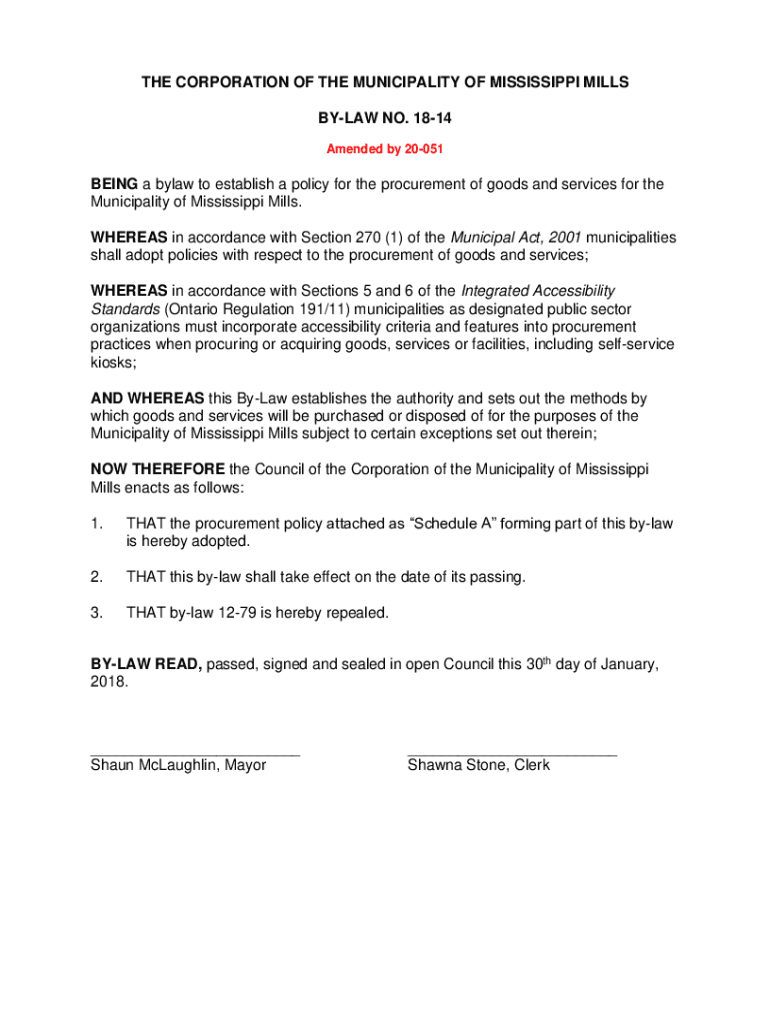 THE CORPORATION OF THE MUNICIPALITY OF MISSISSIPPI MILLS BYLAW NO. 1814 Amended by 20051BEING a bylaw to establish a policy for the procurement of goods and services for the Municipality of Mississippi