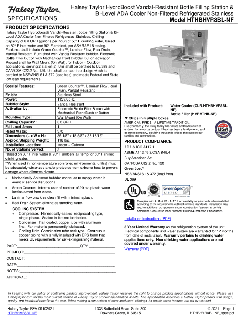 SPECIFICATIONS Halsey Taylor Hydrologist VandalResistant Bottle Filling Station & Level ADA Cooler Unfiltered Refrigerated Stainless Model HTHBHVR8BLNFPRODUCT SPECIFICATIONS Halsey Taylor Hydrologist