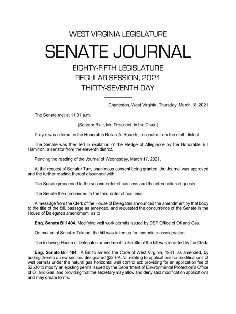 WEST VIRGINIA LEGISLATURESENATE JOURNAL EIGHTIETH LEGISLATURE REGULAR SESSION, 2021 THIRTEENTH DAY Charleston, West Virginia, Thursday, March 18, 2021, The Senate met at 11:01 a.m. (Senator Blair,