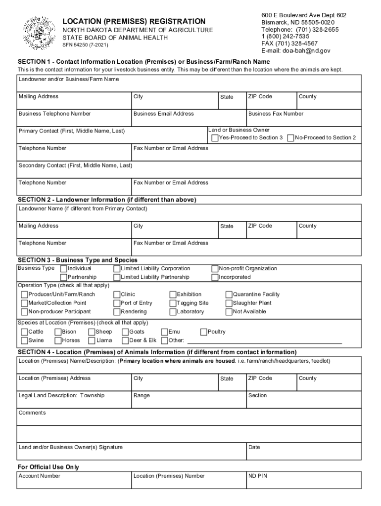 600 E Boulevard Ave Dept 602 Bismarck, ND 585050020 Telephone: (701) 3282655 1 (800) 2427535 FAX (701) 3284567 Email: doabah@nd.govLOCATION (PREMISES) REGISTRATIONNORTH DAKOTA DEPARTMENT OF AGRICULTURE