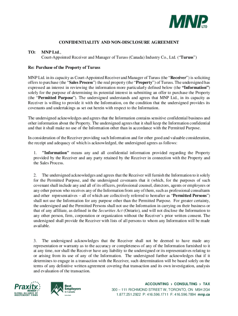 CONFIDENTIALITY AND NONDISCLOSURE AGREEMENT TO:MNP Ltd., Counterpointed Receiver and Manager of Truss (Canada) Industry Co., Ltd. (Truss’Re: Purchase of the Property of Truss MNP Ltd. in its capacity