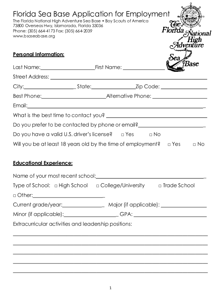 Florida Sea Base Application for Employment Florida National High Adventure Sea Base Boy Scouts of America 73800 Overseas Hwy, Islamabad, Florida 33036 Phone: (305) 6644173 Fax: (305) 6642039 www.bsaseabase.orgPersonal