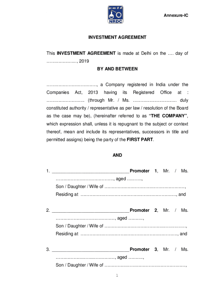 AAnnexureICINVESTMENT Agreements INVESTMENT AGREEMENT is made at Delhi on the . Day of .........., 2019 BY AND BETWEEN., a Company registered in India under the Companies,2013havingitsRegisteredOfficeat:.