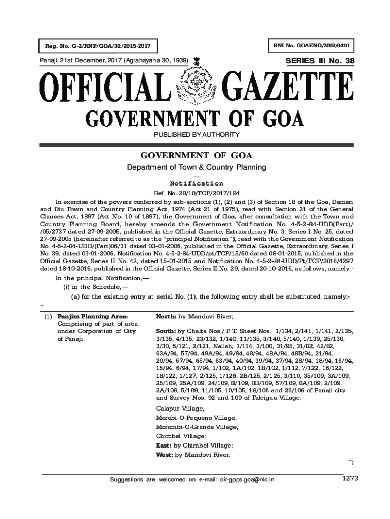 RNA No. GOING/2002/6410Reg. No. G2/RNA/GOA/32/20152017SERIES III No. 38Panaji, 21st December 2017 (Ramayana 30, 1939)PUBLISHED BY AUTHORITYGOVERNMENT OF GOA Department of Town & Country Planning Notification