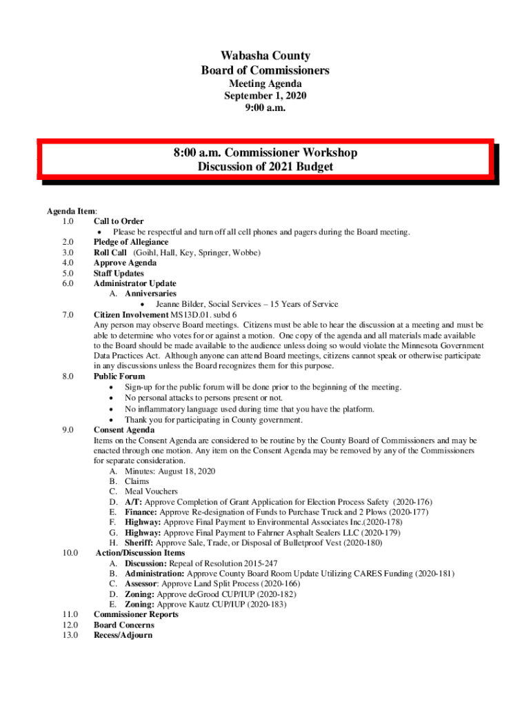 Wabash County Board of Commissioners Meeting Agenda September 1, 2020 9:00 a.m.8:00 a.m. Commissioner Workshop Discussion of 2021 BudgetAgenda Item: 1.0 Call to Order Please be respectful and turn