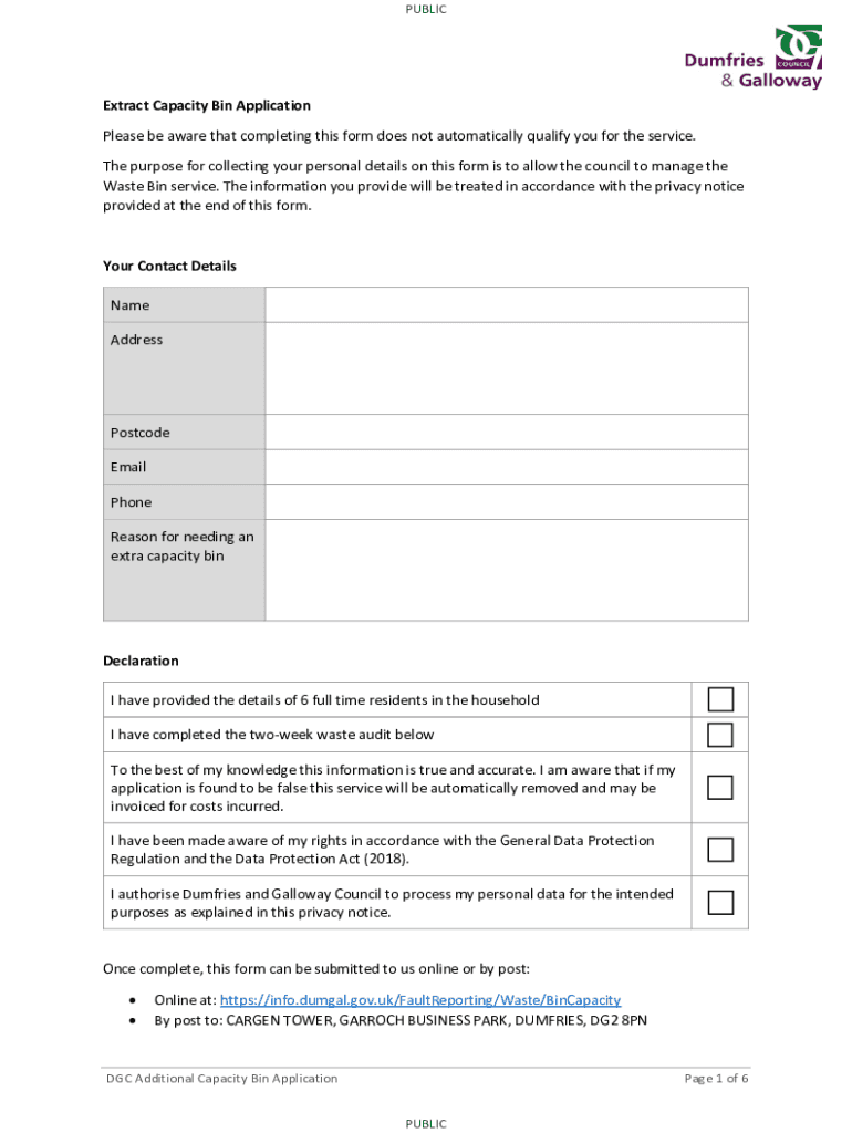 PUBLICExtract Capacity Bin Application Please be aware that completing this form does not automatically qualify you for the service. The purpose for collecting your personal details on this form is
