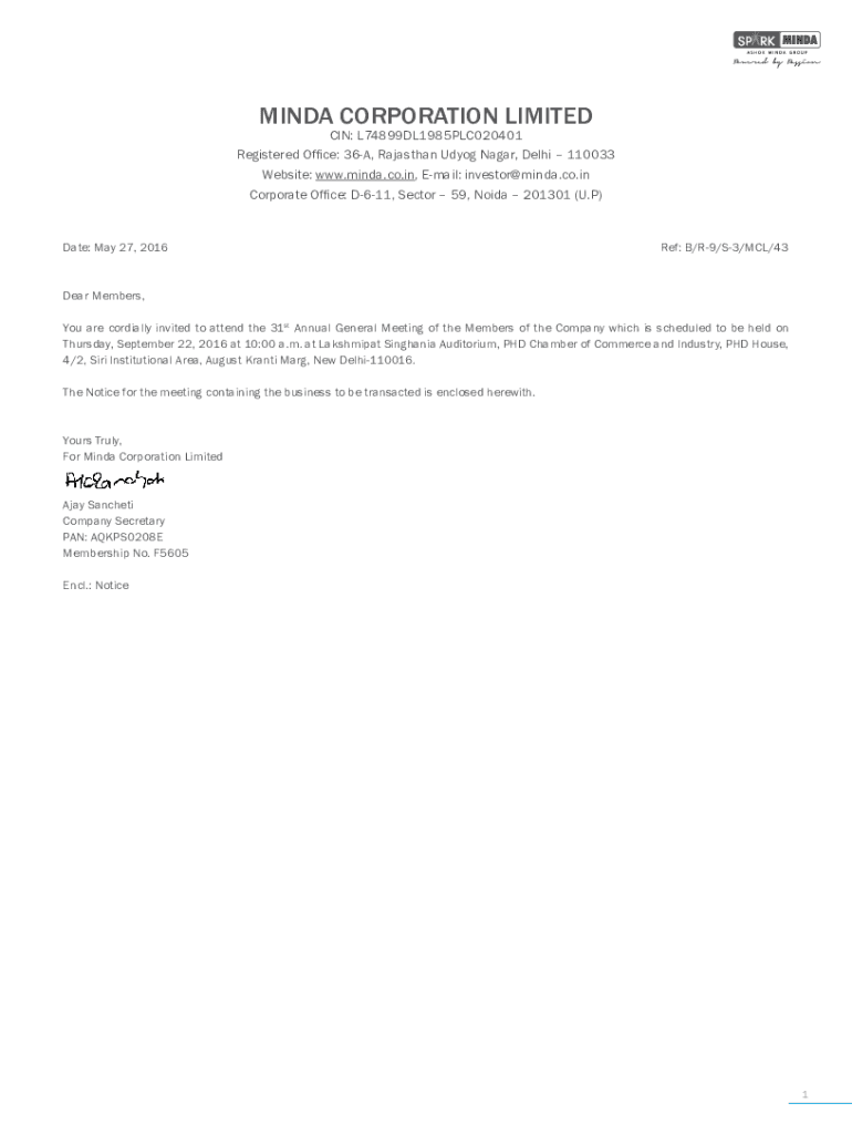 MIND CORPORATION LIMITED: L74899DL1985PLC020401 Registered Office: 36A, Rajasthan Dog Nagar, Delhi 110033 Website: www.minda.co.in, Email: investor@minda.co.in Corporate Office: D611, Sector 59, Noida