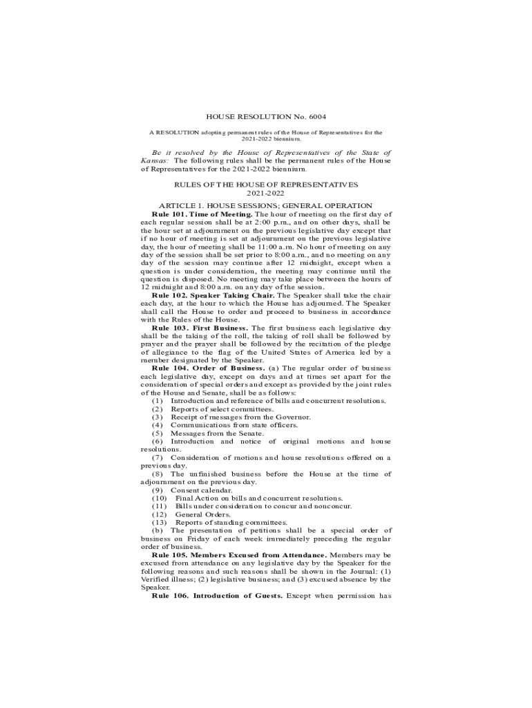 HOUSE RESOLUTION No. 6004 A RESOLUTION adopting permanent rules of the House of Representatives for the 20212022 biennium. Be it resolved by the House of Representatives of the State of Kansas: The