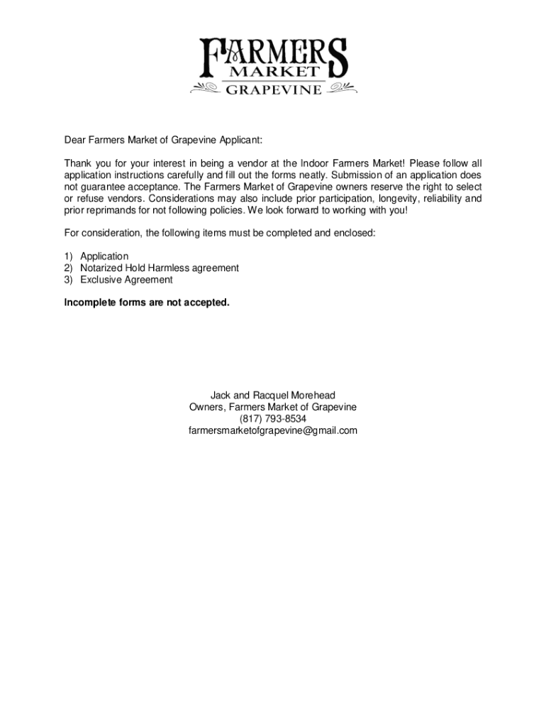 Dear Farmers Market of Grapevine Applicant: Thank you for your interest in being a vendor at the Indoor Farmers Market! Please follow all application instructions carefully and fill out the forms