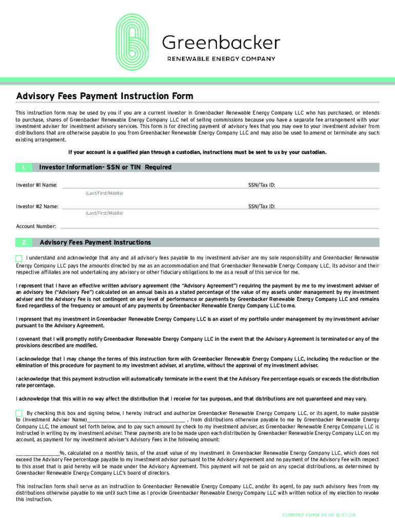Advisory Fees Payment Instruction Form This instruction form may be used by you if you are a current investor in Green backer Renewable Energy Company LLC who has purchased, or intends to purchase,
