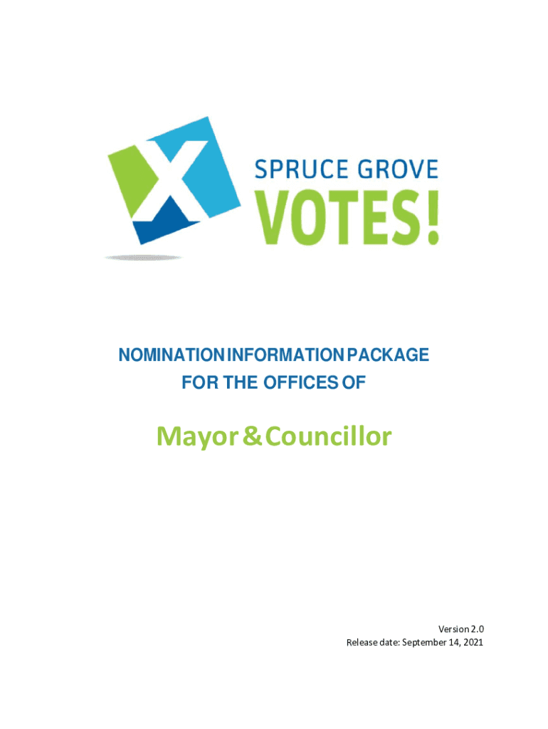 NOMINATION INFORMATION PACKAGE FOR THE OFFICES Mayor & CouncillorVersion 2.0 Release date: September 14, 2021GENERAL INFORMATION City of Spruce Grove 2021 Electricity of Spruce Groves booklet is published