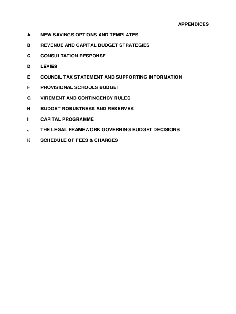 APPENDICES ANEW SAVINGS OPTIONS AND TEMPLATESBREVENUE AND CAPITAL BUDGET STRATEGIESCCONSULTATION RESPONSEDLEVIESECOUNCIL TAX STATEMENT AND SUPPORTING INFORMATIONFPROVISIONAL SCHOOLS BUDGETGVIREMENT