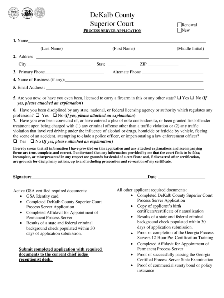 DeKalb County Superior CourtRenewal Reprocess SERVER APPLICATION 1. Name (Last Name)(First Name)(Middle Initial)2. Address CityState3. Primary Phone ZIP Alternate Phone 4. Name of Business (if any):