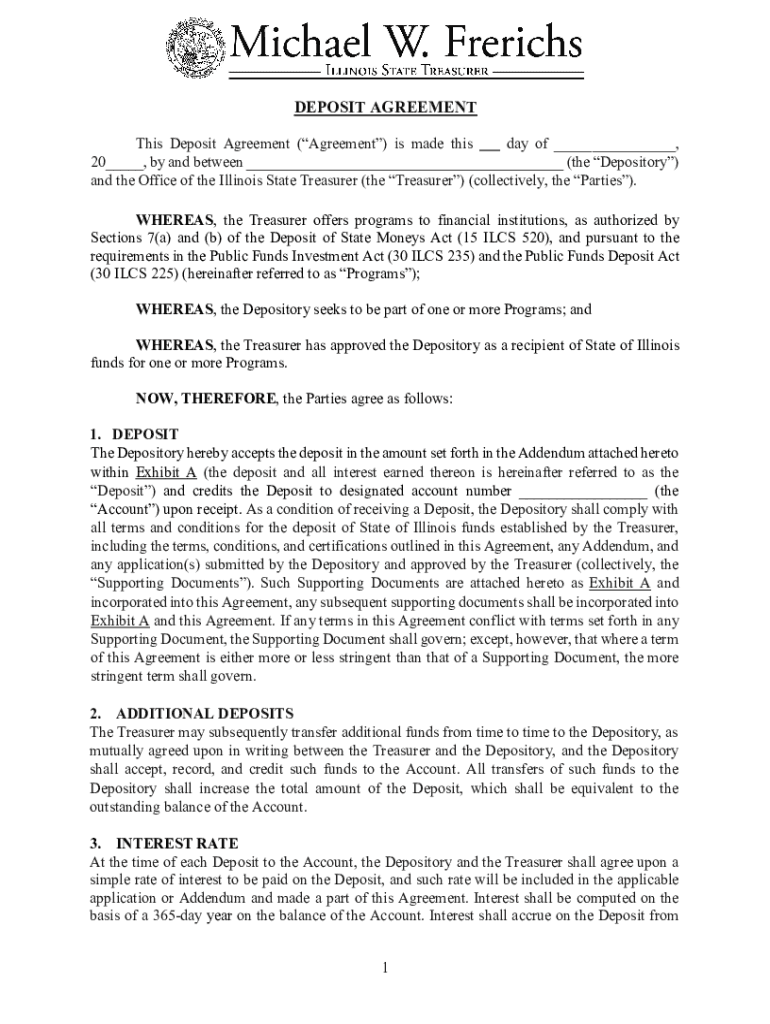 DEPOSIT AGREEMENT This Deposit Agreement (Agreement) is made this day of, 20, by and between (the Depository) and the Office of the Illinois State Treasurer (the Treasurer) (collectively, the Parties).