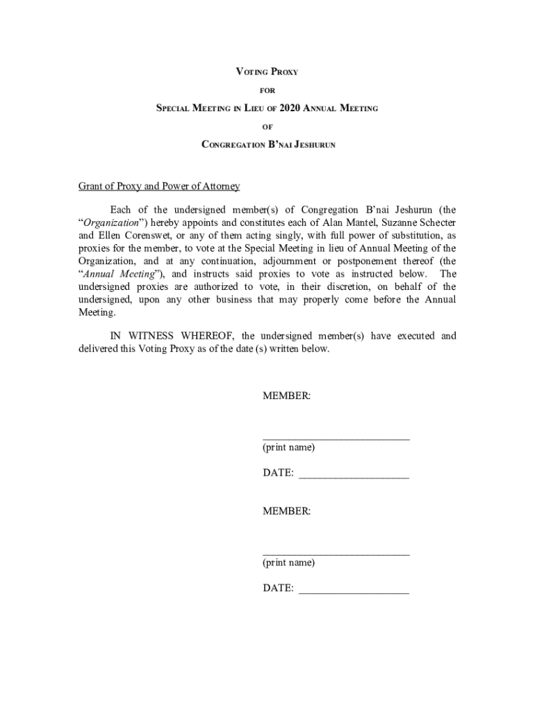 VOTING PROXY SPECIAL MEETING IN LIEU OF 2020 ANNUAL MEETING CONGREGATION BNA JESHURUNGrant of Proxy and Power of Attorney Each of the undersigned member(s) of Congregation Bani Jeshua (the Organization)